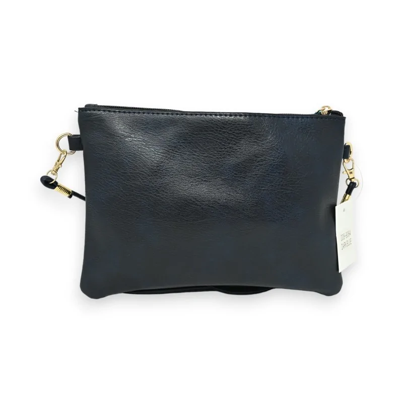 Découvrez ce sac pochette bandoulière élégant en matière synthétique bleu marine, parfaitement rehaussé par une étoile argentée brillante située au centre. Ce détail glamour apporte une touche de sophistication à l'accessoire. Le sac comprend une poche centrale équipée d'une fermeture éclair, offrant une solution sécurisée et pratique pour ranger vos essentiels comme les clés, le téléphone, et le portefeuille. Muni d'une sangle fine, ce sac peut être porté confortablement en bandoulière ou sur l'épaule, adaptant son style à vos besoins. Ses dimensions de 23 cm de largeur par 16 cm de hauteur en font un choix idéal pour les événements sociaux ou les sorties quotidiennes où l'élégance est de mise.