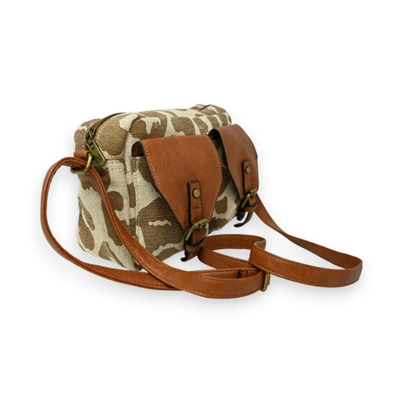 Ce sac bandoulière, inspiré par l'esprit safari, affiche une esthétique robuste avec son design en toile de jute épaisse dans des nuances de marron et beige. Le sac est équipé de deux poches avant en bi-matière, mêlant tissu et synthétique, qui se ferment grâce à un système de fermeture magnétique, offrant sécurité et facilité d'accès. À l'intérieur, la poche centrale est spacieuse et comprend plusieurs poches plaquées sur les côtés pour une organisation optimale de vos affaires personnelles. Une poche arrière supplémentaire augmente encore plus l'espace de stockage disponible. Avec sa sangle en synthétique réglable, ce sac de dimensions 28 cm par 18 cm est parfait pour les aventures urbaines ou les escapades en nature, alliant fonctionnalité et style durable.