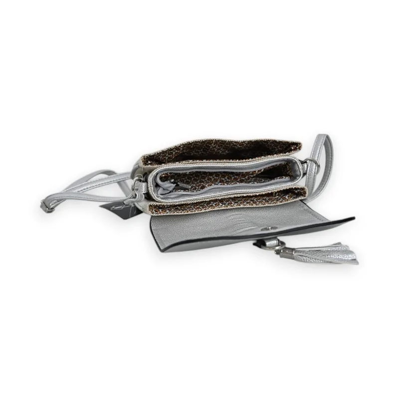 Les finitions argentées et la doublure au motif vintage ajoutent une touche de raffinement, tandis que la bandoulière réglable assure un port confortable. Avec ses dimensions de 24 x 15 x 5 cm, ce sac est idéal pour un usage quotidien, permettant de transporter l'essentiel avec style.