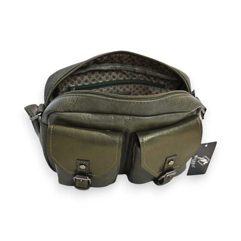 Le sac bandoulière de la collection Mélanie Paris se démarque par son design contemporain et sa finition kaki sophistiquée. La matière synthétique utilisée reproduit à la perfection l'aspect et le toucher du cuir véritable, offrant une alternative éthique et durable. Les rabats avant en kaki brillant créent un contraste élégant avec la texture mate du corps du sac, tandis que les finitions métalliques des fermetures ajoutent une touche de modernité.