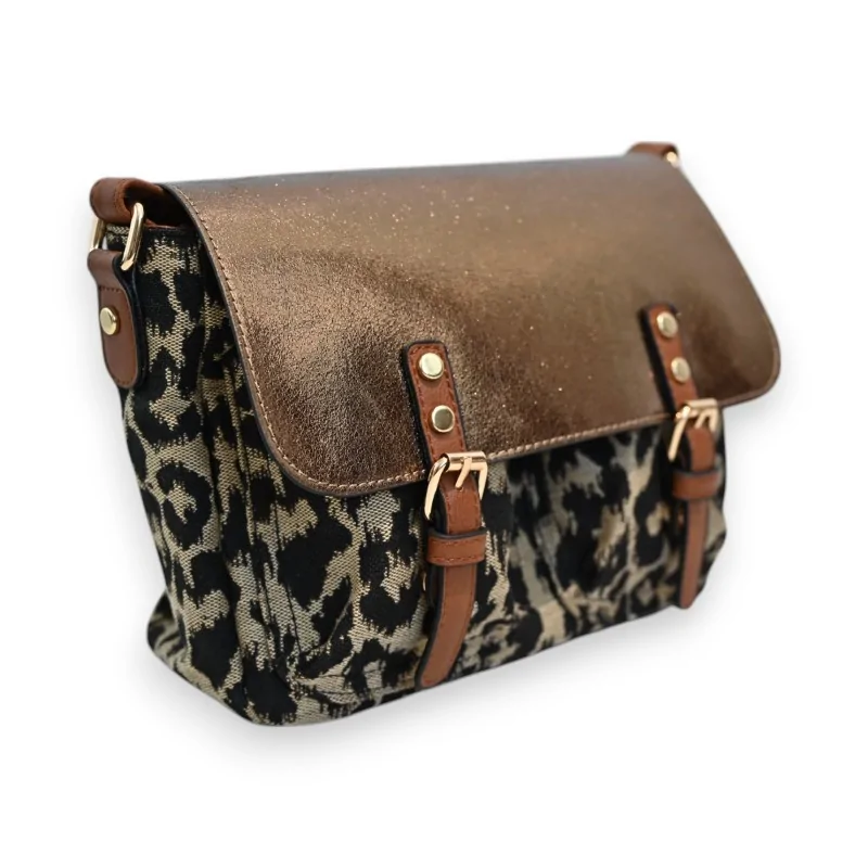 Le sac bandoulière Mélanie Paris conjugue élégance et praticité avec son design bi-matière associant un tissu lin imprimé léopard taupe et noir à une finition synthétique cuivrée brillante. Ses sangles camel aimantées et sa bandoulière réglable offrent un style sophistiqué tout en facilitant son utilisation au quotidien.