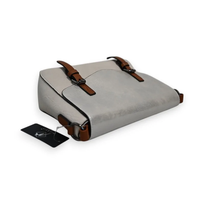 Le sac bandoulière de la collection Mélanie Paris se distingue par son design épuré et moderne. La combinaison du synthétique beige et du rabat argenté brillant crée un contraste élégant, rehaussé par les sangles camel qui apportent une touche de chaleur à l'ensemble. Cette alliance de teintes neutres permet une polyvalence dans les tenues, s'adaptant aussi bien à un style casual qu'à une tenue plus habillée. La finition métallisée du rabat capture subtilement la lumière, donnant au sac un aspect précieux et raffiné.