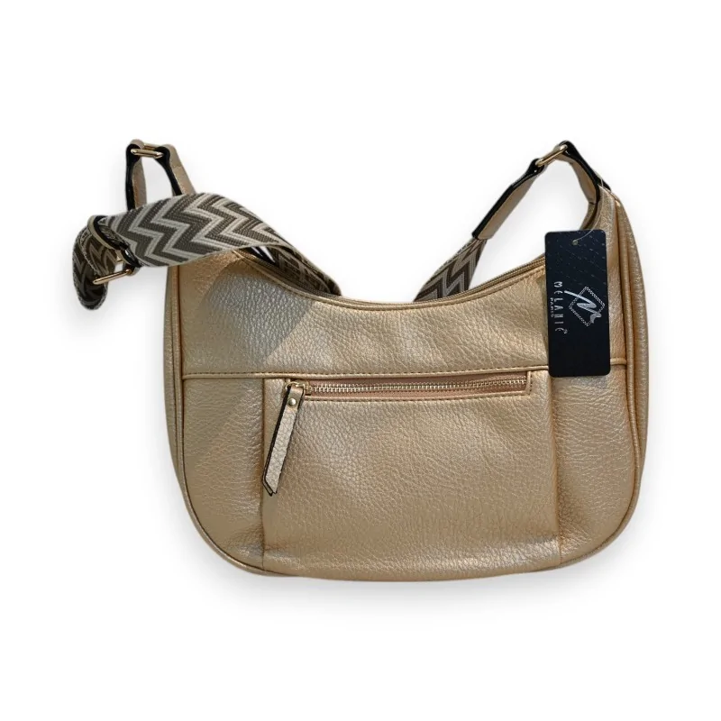 Le sac bandoulière Mélanie Paris se distingue par son design contemporain et sa finition dorée luxueuse. Sa forme banane tendance offre un style urbain tout en conservant une élégance raffinée. La conception intelligente avec ses multiples compartiments en fait un accessoire aussi pratique que sophistiqué.