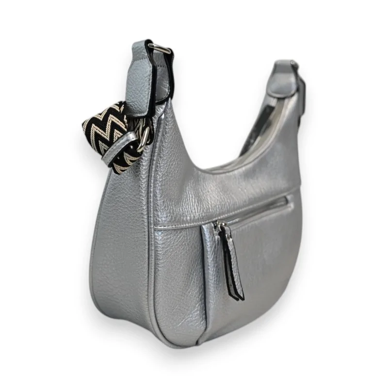 Le sac bandoulière Mélanie Paris en finition argentée allie élégance et praticité. Sa forme banane tendance et ses multiples compartiments en font l'accessoire idéal pour un quotidien organisé. La bandoulière réglable ornée d'un motif ethnique chic assure un port confortable.