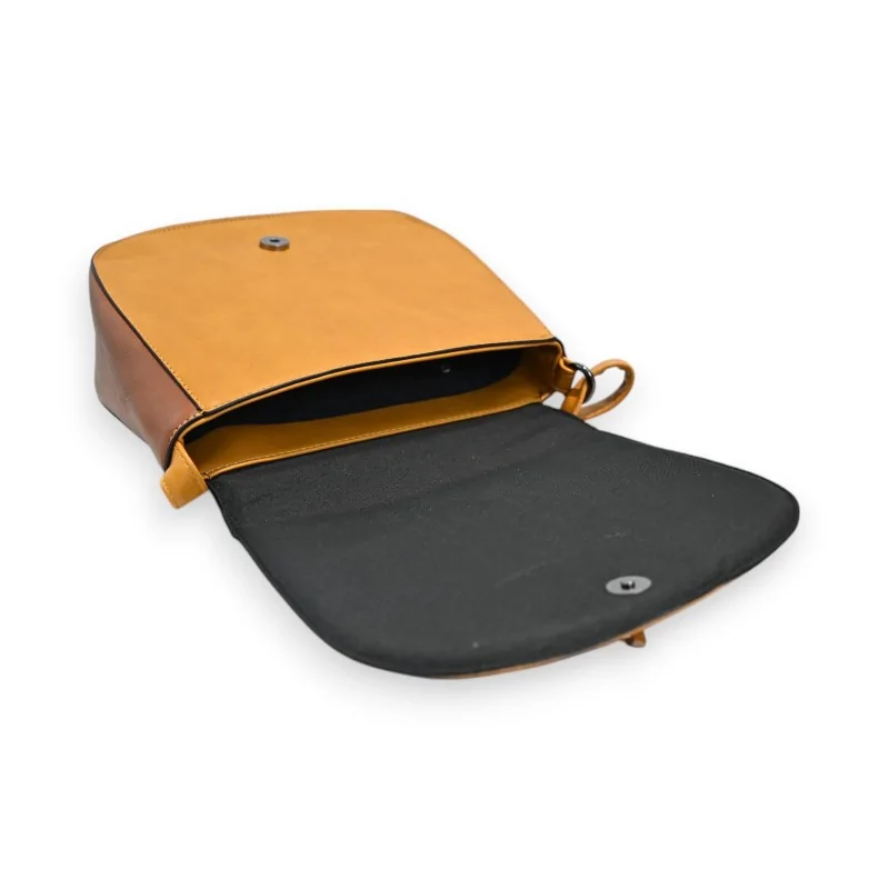 Le sac bandoulière Mélanie Paris incarne l'élégance à la française avec son design bicolore moutarde et camel. Son rabat orné d'un tissage aux fils dorés et noirs apporte une touche de sophistication unique. La conception fonctionnelle offre de multiples rangements avec une grande poche centrale et des poches plaquées dont une zippée pour une organisation optimale.