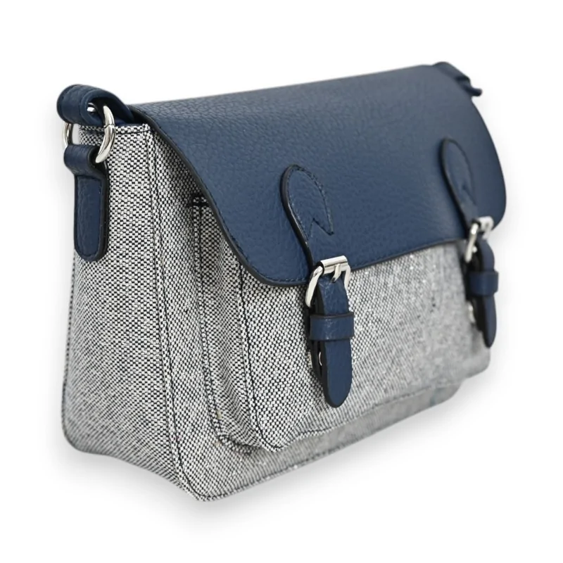Le sac bandoulière Mélanie Paris se distingue par son style cartable revisité qui mêle authenticité et modernité. La combinaison du cuir synthétique bleu marine et du lin moucheté crée un contraste sophistiqué, sublimé par les fils lurex argentés qui apportent une touche de brillance subtile. Les deux sangles sur le rabat, dotées de fermoirs aimantés chromés, rappellent l'esprit cartable tout en offrant une fermeture pratique et sécurisée.