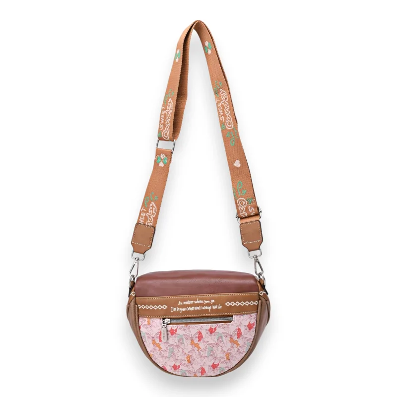 Découvrez le sac banane bandoulière de la marque Sweet & Candy, orné d'un magnifique motif de papillons multicolores dans des nuances raffinées de camel et marron. Ce modèle original et pratique est conçu pour être votre compagnon idéal au quotidien, vous permettant de l'emporter partout avec style. Une petite poche zippée à l'avant est parfaite pour ranger vos petits objets essentiels, tandis que la grande poche centrale, dotée d'une poche plaquée à l'intérieur, offre un espace de rangement spacieux et bien organisé. À l'arrière, une poche supplémentaire avec zip assure la sécurité de vos objets de valeur. La sangle réglable en tissu tendance et confortable garantit un ajustement optimal et un port agréable. Avec des dimensions de 23x14x12 cm, ce sac banane allie esthétisme et fonctionnalité, idéal pour toutes vos sorties.