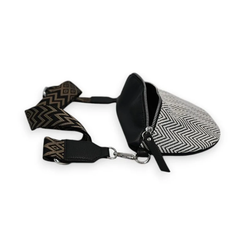 Le motif chevron noir et blanc de ce sac banane crée un impact visuel saisissant qui attire immédiatement l'attention. Les détails dorés, soigneusement intégrés aux finitions, apportent une touche de raffinement et de luxe à l'ensemble. La combinaison du tissage géométrique avec les éléments en similicuir noir crée un contraste élégant qui s'accorde parfaitement avec différents styles vestimentaires.