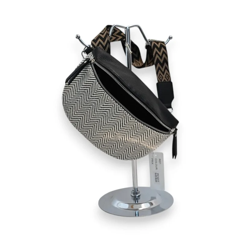 Ce sac banane contemporain allie style et fonctionnalité avec son motif chevron noir et blanc distinctif. Ses finitions dorées apportent une touche d'élégance, tandis que sa conception pratique avec multiples compartiments permet un rangement optimal. La sangle ajustable et amovible offre un porter confortable et modulable.