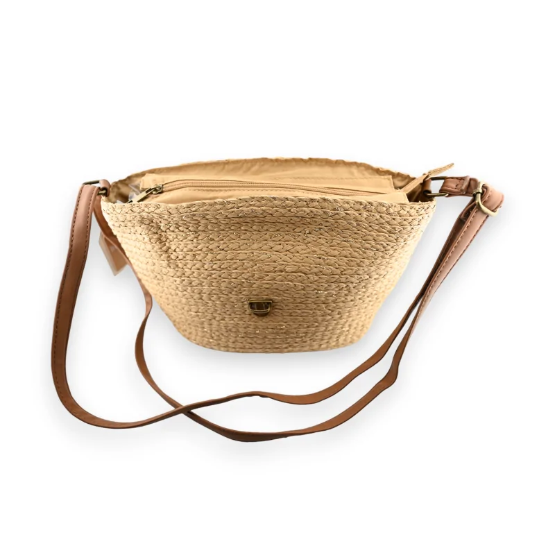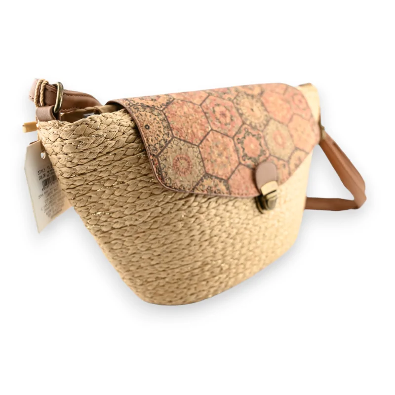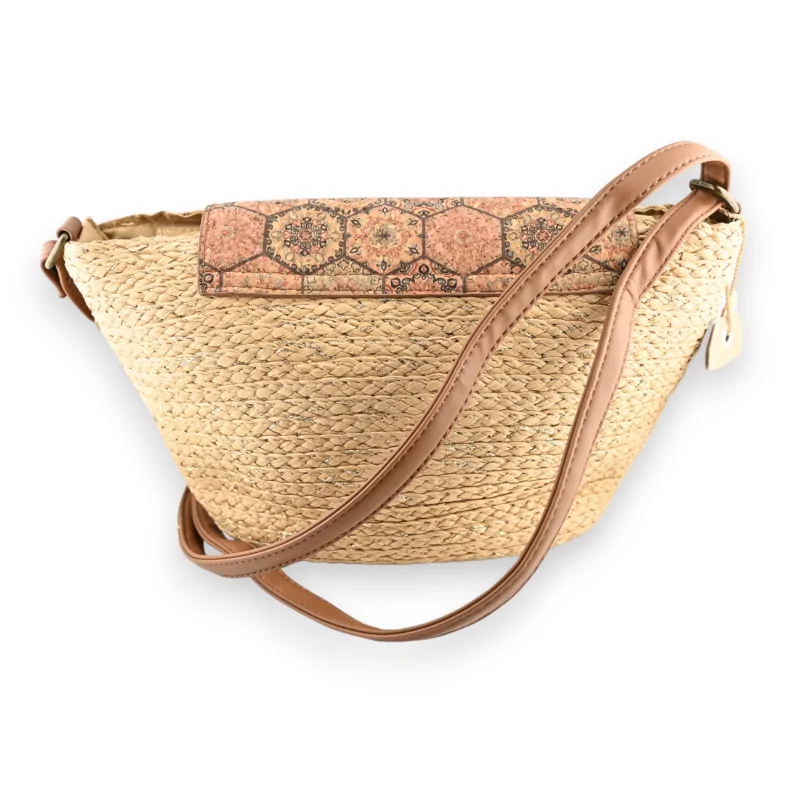 Ce sac bandoulière, mêlant harmonieusement la paille et le liège, est l'accessoire parfait pour évoquer l'ambiance estivale. Le rabat en liège apporte une texture naturelle et un contraste élégant avec le corps principal en paille, créant un design à la fois rustique et sophistiqué. Un des points forts de ce sac est son système d'ouverture et de fermeture vintage : un bouton poussoir en métal, qui non seulement ajoute une touche rétro mais garantit également une sécurité accrue pour vos affaires. La sangle de la bandoulière, fixe et non amovible, est conçue pour offrir un confort optimal lors du port du sac. À l'intérieur, le sac révèle une grande poche centrale fermée par une fermeture éclair, offrant un espace de rangement spacieux pour tous vos essentiels, comme un portefeuille, un téléphone, des lunettes de soleil, et même un petit livre ou un agenda. De plus, plusieurs poches intérieures plaquées sont présentes, idéales pour organiser des objets plus petits et les garder à portée de main. Avec ses dimensions généreuses de 31x21 cm, ce sac est suffisamment grand pour répondre à vos besoins quotidiens tout en restant élégant et facile à porter.