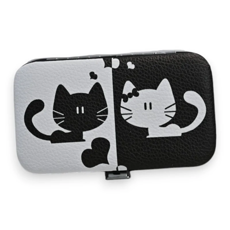 Ce set de manucure compact allie parfaitement esthétique et fonctionnalité avec son motif original de chats en noir et blanc. L'étui de 11x6cm renferme une sélection complète d'instruments essentiels pour des soins des ongles professionnels. La qualité premium des outils en métal argenté garantit durabilité et précision dans les soins.
