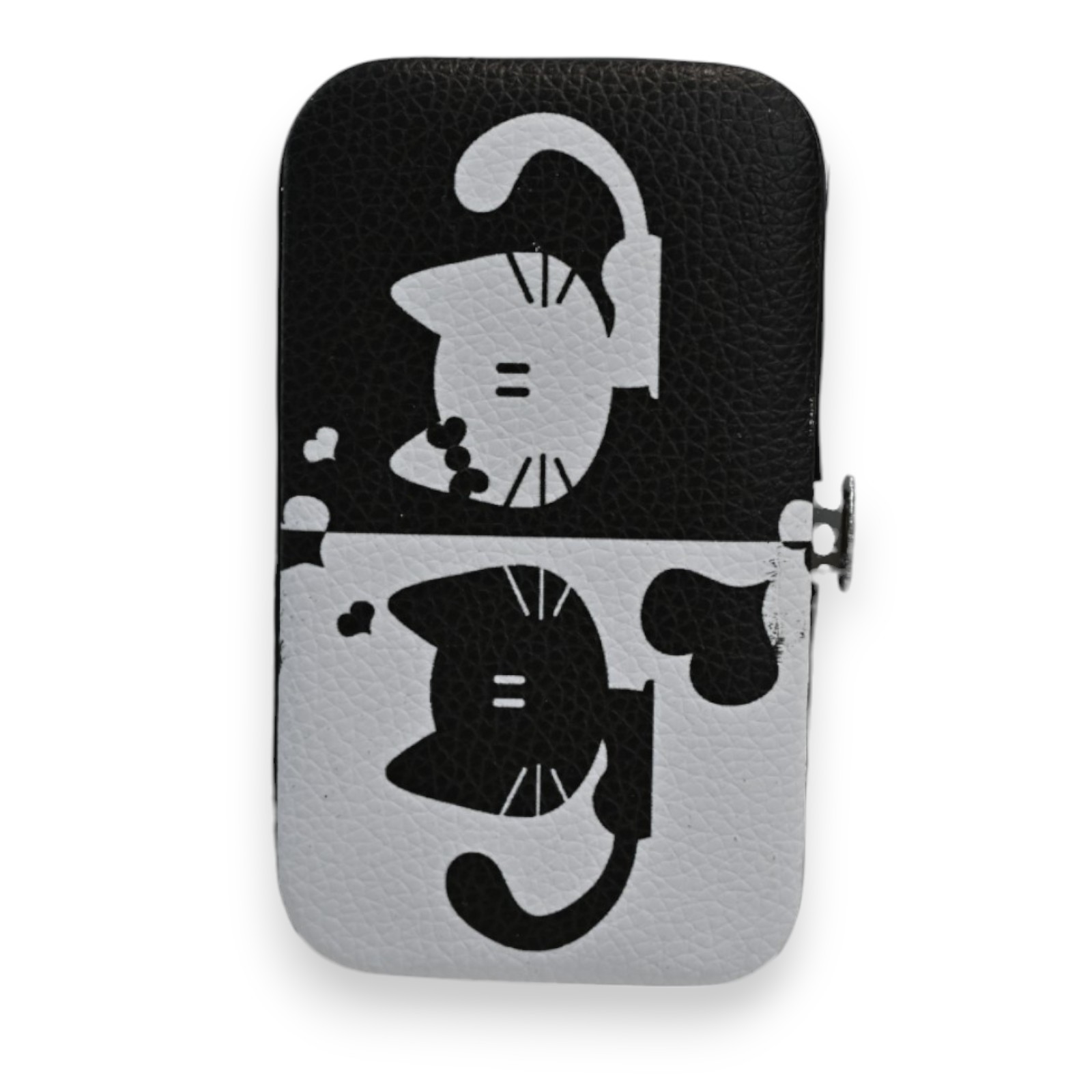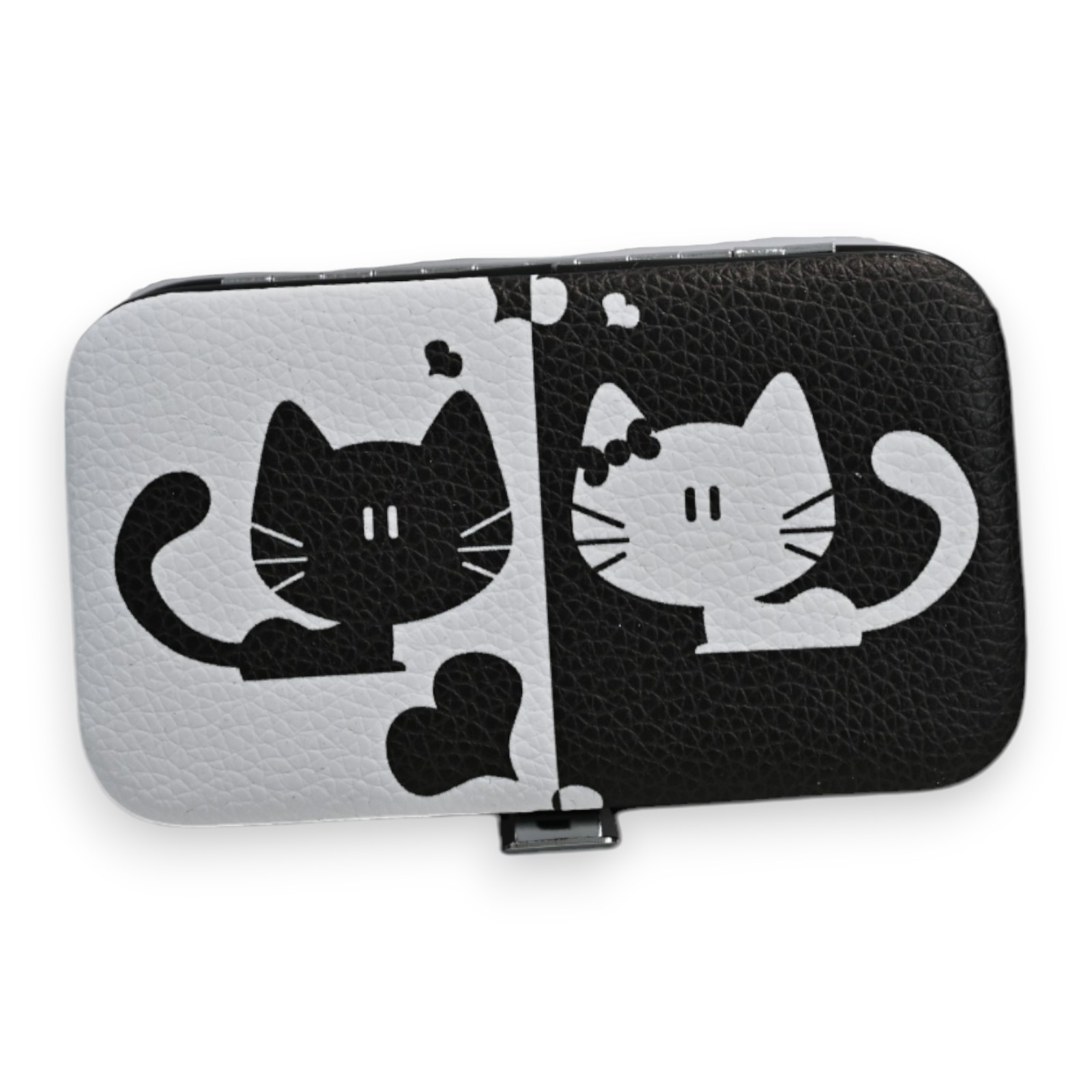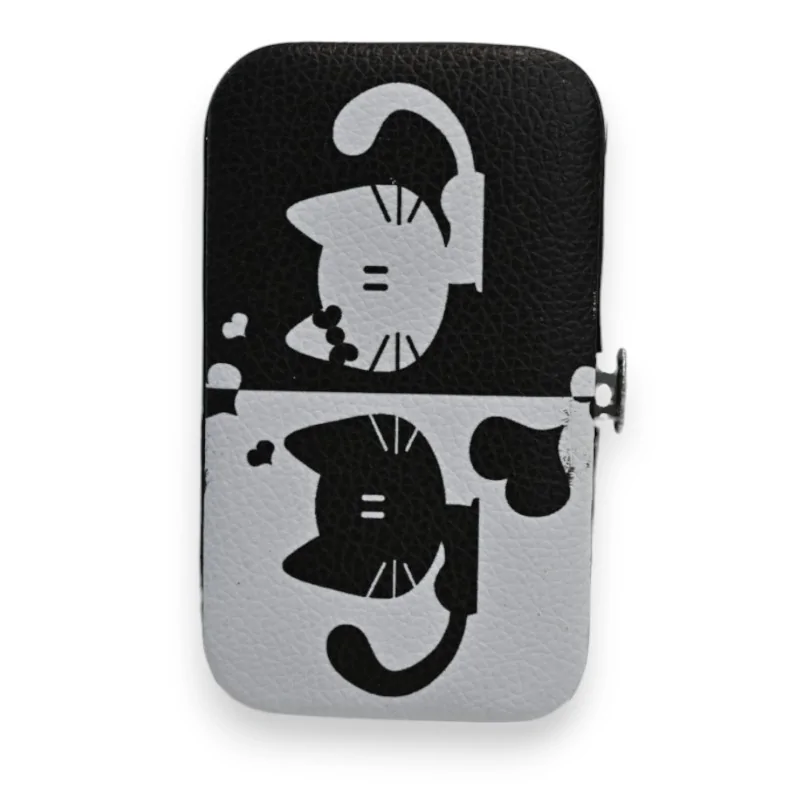 Ce ravissant set de manucure compact arbore un design unique noir et blanc avec des motifs de chats stylisés. L'étui de 11x6cm contient tous les essentiels pour une manucure impeccable : deux coupe-ongles de tailles différentes, une lime professionnelle, un pousse-cuticules précis, une pince à épiler et des ciseaux de qualité.