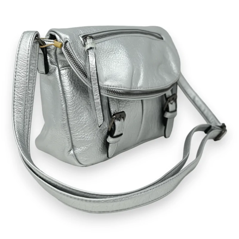 Questa borsa a tracolla, brillante nella sua tonalità argento, è l'accessorio perfetto per esaltare i vostri abiti estivi. Il suo design si ispira alla classica cartella, offrendo un tocco retro-chic con un accento moderno. La borsa si distingue per i suoi molteplici spazi di conservazione: un risvolto innovativo con una tasca integrata all'interno e un'altra sulla cima, per un accesso rapido ai vostri piccoli oggetti. Due cinturini dotati di sistemi di chiusura magnetici assicurano l'apertura, mentre due tasche anteriori e un ampio scomparto principale, dotato di una divisione centrale e di una zip, organizzano efficacemente i vostri essenziali. All'interno, tasche a toppa accuratamente disposte sui lati massimizzano lo spazio di stoccaggio. Una tasca con zip sul retro aggiunge una dimensione extra di praticità a questa borsa. Con le sue dimensioni compatte di 24x22 cm, questa borsa a tracolla non solo offre spazio; propone una moltitudine di nascosti ingegnosi per tutti i vostri tesori.