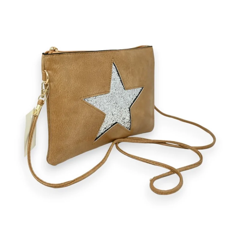 Questa tracolla pochette di colore cammello in materiale sintetico è l'accessorio perfetto per aggiungere un tocco di eleganza a qualsiasi outfit. Al centro, una stella argentata brillante attira l'occhio, aggiungendo un dettaglio affascinante al design sobrio della borsa. La tasca centrale si chiude con una zip, garantendo la sicurezza dei tuoi essenziali pur offrendo un facile accesso. La tracolla sottile e regolabile permette di indossarla a tracolla per uno stile casual o sull'omero per un look più chic. Con le sue dimensioni di 23 cm di larghezza e 16 cm di altezza, questa borsa è ideale per trasportare i tuoi oggetti personali senza ingombro, abbinandosi perfettamente con una gamma di stili di abbigliamento, dai più casual ai più formali.