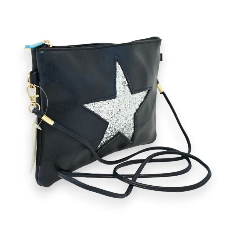 Scopri questa elegante tracolla pochette in materiale sintetico blu marino, perfettamente esaltata da una stella argentata brillante situata al centro. Questo dettaglio glamour aggiunge un tocco di sofisticatezza all'accessorio. La borsa comprende una tasca centrale con cerniera, fornendo una soluzione sicura e pratica per riporre i tuoi essenziali come chiavi, telefono e portafoglio. Dotata di una sottile tracolla, questa borsa può essere comodamente indossata a tracolla o sulla spalla, adattando il suo stile alle tue esigenze. Le sue dimensioni di 23 cm di larghezza per 16 cm di altezza ne fanno una scelta ideale per eventi sociali o uscite quotidiane dove l'eleganza è d'obbligo.