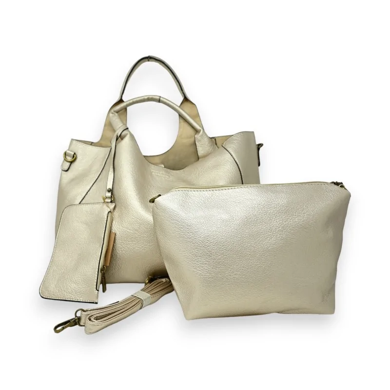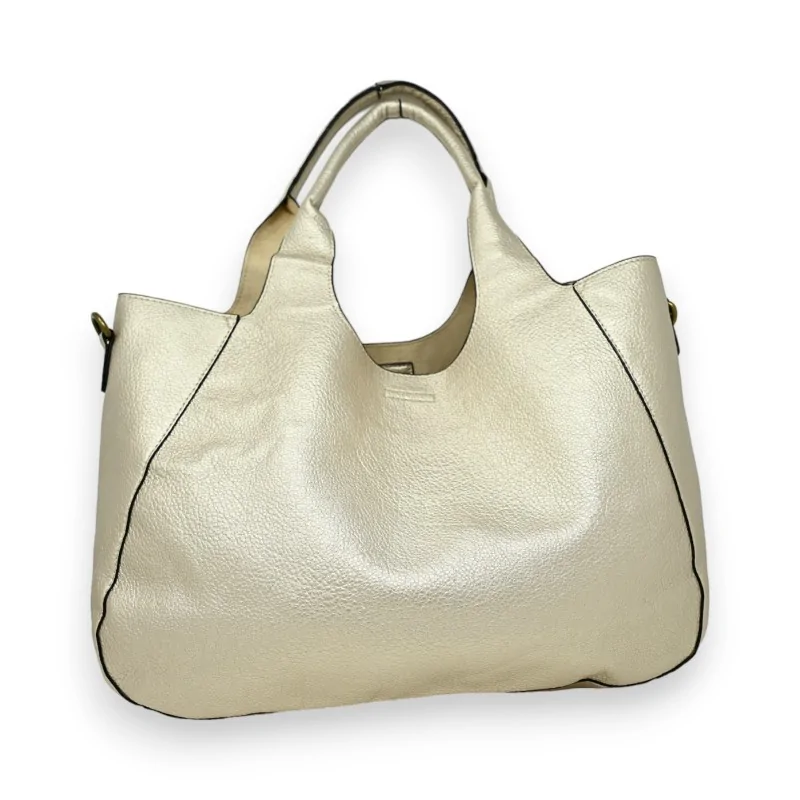 Immergiti in un mondo di eleganza sofisticata con questa grande borsa morbida e i suoi accessori abbinati. Il dorato metallico, un colore sia delicato che brillante, diventa l'essenza stessa del raffinamento, adattandosi armoniosamente a tutti i tuoi outfit. La texture granulosa del sintetico offre un'imitazione notevole del cuoio, aggiungendo un tocco di lusso al tuo stile quotidiano. All'interno, una grande tasca centrale semplice offre uno spazio spazioso per organizzare i tuoi oggetti essenziali con facilità. La presenza di una grande pochette rimovibile con tracolla ti permette di rimanere organizzata e pronta per ogni occasione, offrendo una praticità versatile alla tua borsa. Inoltre, un portamonete rimovibile visibile sul davanti della borsa aggiunge una funzionalità supplementare, permettendoti di accedere rapidamente ai tuoi piccoli oggetti indispensabili. Con le sue dimensioni generose di 49 per 29 centimetri, questa borsa diventa l'accessorio indispensabile per accompagnarti nelle tue giornate piene con stile e agilità.