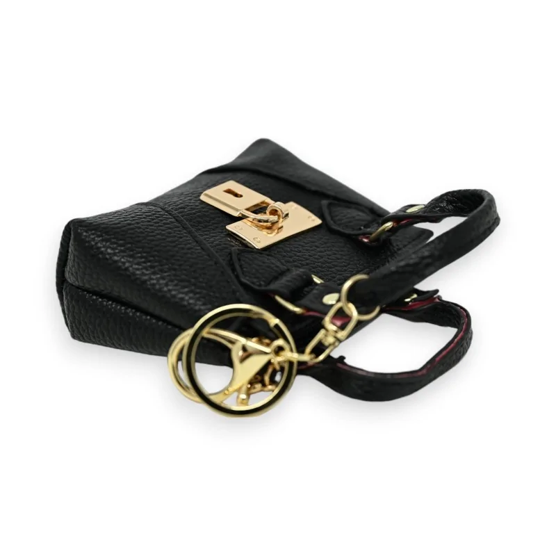 Questo portachiavi e portamonete di colore nero è l'essenza della raffinatezza. Ispirato dai disegni eleganti delle borse, questo accessorio in miniatura è valorizzato da un lucchetto dorato che non manca di aggiungere un tocco di lusso. Progettato per la massima facilità d'uso, incorpora un moschettone e un anello ad uncino, permettendovi di attaccarlo dove desiderate - sia che si tratti delle vostre chiavi, di una borsa, o addirittura di una cintura. La sua piccola cerniera è perfettamente progettata per proteggere le vostre monete e altri piccoli essenziali, mantenendo al contempo un profilo basso ed elegante. Con le sue dimensioni pratiche di 11 x 8 cm, è ideale per un'organizzazione stilizzata ed efficiente dei vostri piccoli oggetti.