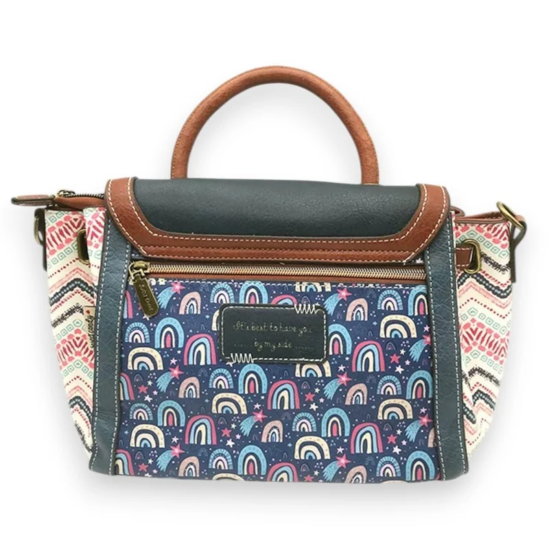 La borsa Sweet Candy Fantasy si distingue per il suo design unico che mescola eleganza classica e tocchi bohémien. La parte anteriore presenta una deliziosa illustrazione in toni pastello raffigurante un paesaggio fiabesco di castelli e mongolfiere. I lati della borsa sono decorati con un motivo geometrico colorato che richiama le stampe etniche, per un look bohémien chic. Con le sue dimensioni di 30(27) x 20 x 12 cm, questa borsa versatile si adatta perfettamente all'uso quotidiano pur rimanendo compatta.