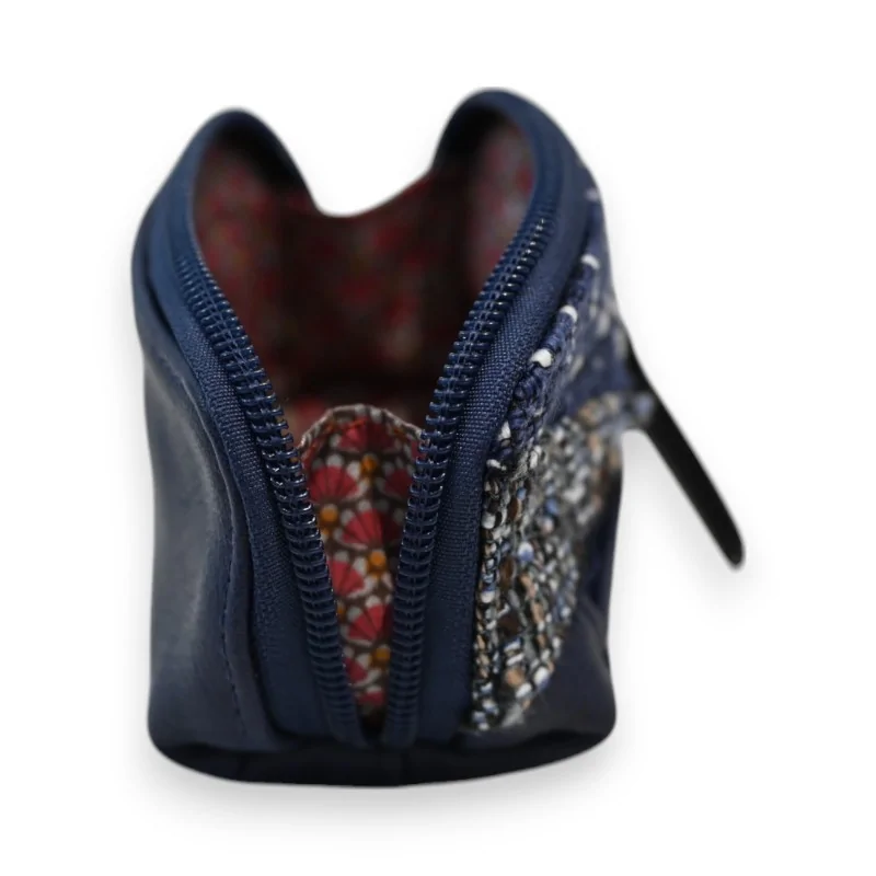 Il portafoglio patchwork della collezione Mélanie Paris colpisce per il suo design sofisticato che mescola diverse texture e motivi. La parte frontale presenta un assemblaggio patchwork minuzioso in tonalità di blu sottilmente coordinate, creando un effetto visivo accattivante. Il lavoro artigianale del tessuto patchwork testimonia una particolare attenzione ai dettagli, con motivi geometrici che si intrecciano armoniosamente.