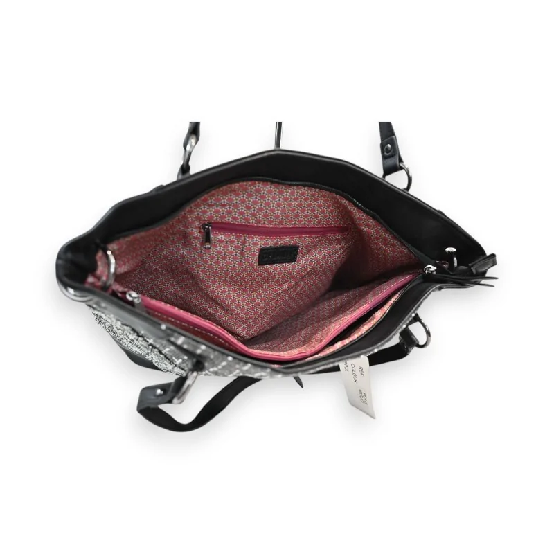 Questa borsa Mélanie Paris si distingue per la sua estetica unica che combina diverse texture e motivi. Il patchwork sulla parte frontale mescola abilmente tessuti con motivi geometrici in nero e grigio, creando un effetto visivo moderno e sofisticato. La finitura in materiale sintetico nero sui bordi e nei dettagli aggiunge un tocco di eleganza garantendo allo stesso tempo un'eccellente resistenza all'usura quotidiana.