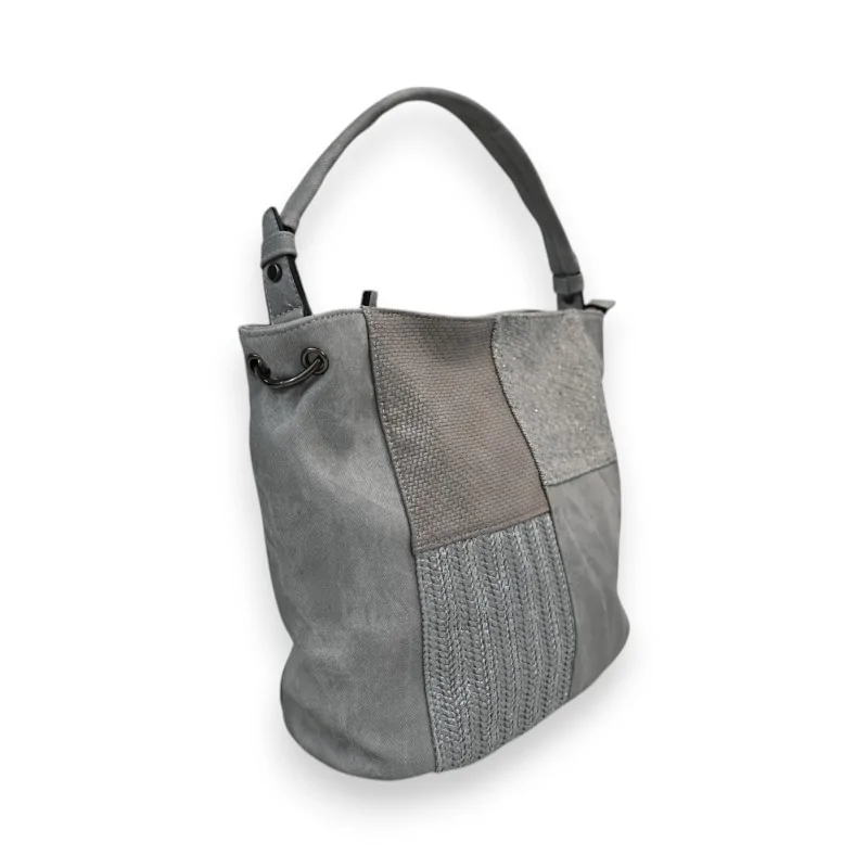 La borsa a mano patchwork Mélanie Paris si distingue per il suo design contemporaneo in materiale sintetico grigio. Il motivo patchwork sul davanti combina diverse texture per uno stile unico e raffinato. Questo modello spazioso di 36x26cm offre un'organizzazione ottimale grazie alla sua grande tasca centrale e ai compartimenti laterali.
