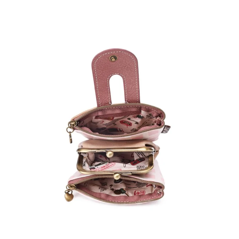Il portamonete Sweet & Candy si distingue per il suo design incantevole. Una bambina, un faro, francobolli e timbri si fondono armoniosamente su uno sfondo rosa, creando un effetto visivo sorprendente e unico.