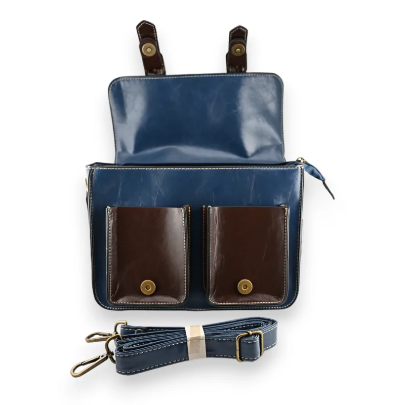 Questa borsa a tracolla vintage blu e marrone offre un look chic e alla moda. Realizzata in similpelle resistente, questa borsa è ideale per l'uso quotidiano con le sue tasche pratiche e una tracolla regolabile per un utilizzo versatile. Le sue dimensioni di 27x7,50x18 cm la rendono un accessorio compatto ed elegante, perfetto per una persona in movimento. Grazie alle sue innovative cinghie magnetiche, questa borsa si chiude in totale sicurezza aggiungendo un tocco retrò.