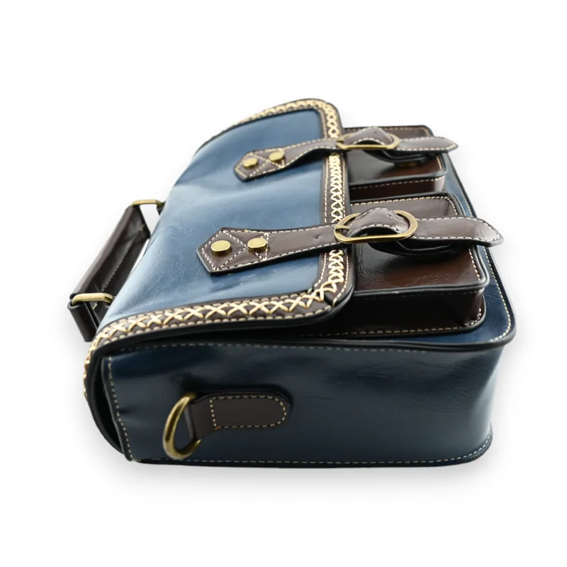 La borsa cartella vintage blu e marrone è ricca di attributi che la distinguono dagli altri modelli di borse sul mercato. Dall'eleganza del suo design all'organizzazione interna, passando per l'accattivante combinazione di colori, questa borsa è un perfetto compromesso tra estetica raffinata e praticità ricercata.