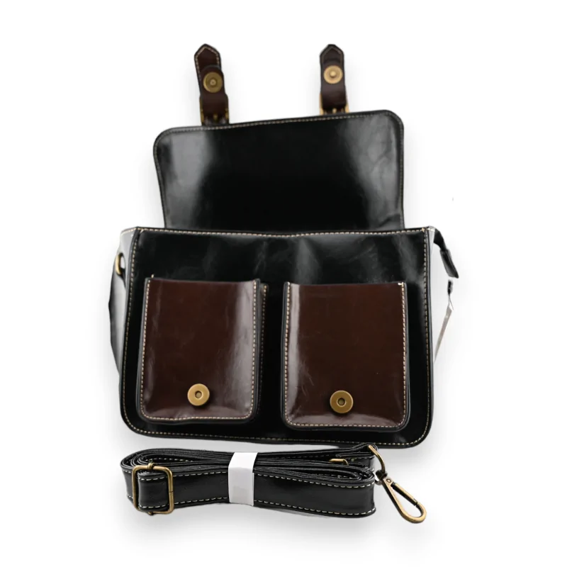 Dotata di un grazioso portachiavi rimovibile in similpelle color senape a forma di busta, questa borsa unisce praticità e stile. Il suo interno accuratamente progettato include una fodera vintage bordeaux, una separazione centrale con cerniera e pratiche tasche laterali per un'organizzazione ottimale dei tuoi effetti personali.