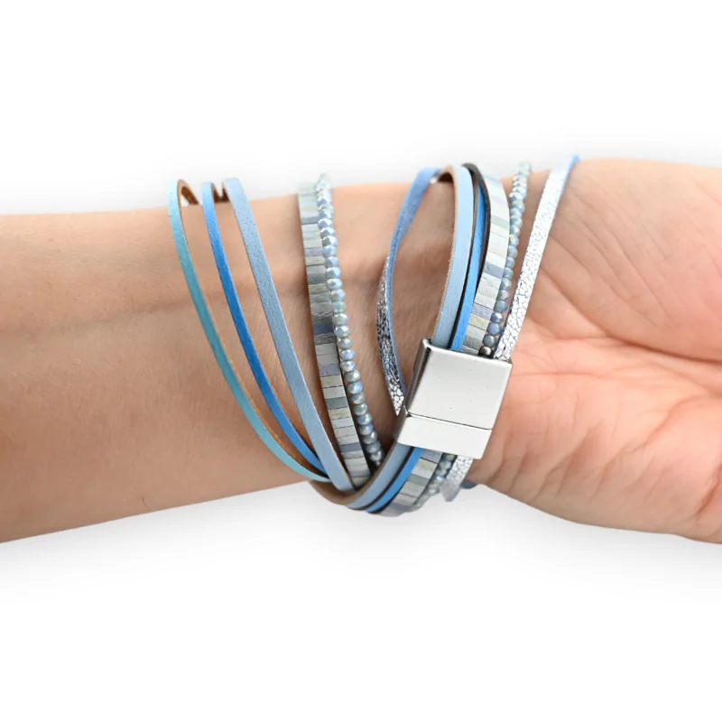 Questo braccialetto è un elegante set di braccialetti a doppio giro per il polso. Misura 39 cm di lunghezza, il che permette un comodo avvolgimento attorno al polso per una vestibilità sicura ed elegante. La tonalità di blu cielo dominante offre un tocco di colore morbido e rilassante, rendendolo ideale per le giornate di sole o per completare un outfit primaverile.