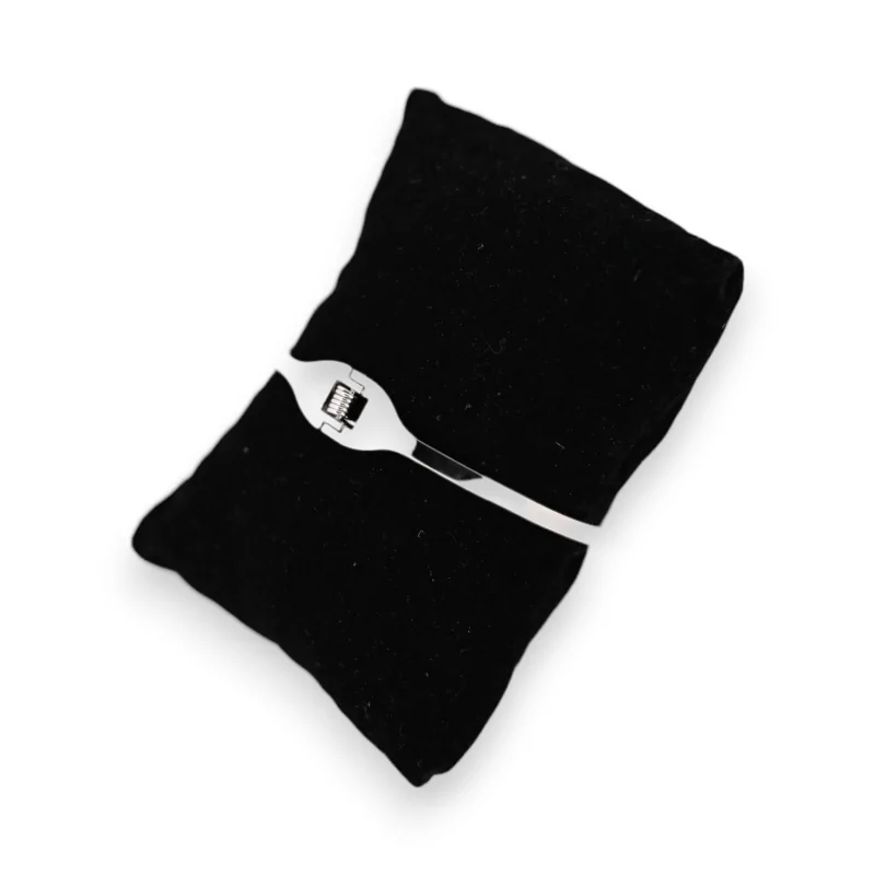 Questo braccialetto rigido in acciaio argentato è la perfetta incarnazione dell'eleganza classica, pensato per gli amanti dei gioielli che apprezzano la raffinatezza e la finezza. Il suo design rigido è magnificamente punteggiato da luminose perle bianche e brillanti strass, creando un gioco di luci affascinante che attira lo sguardo e incanta lo spirito. Ogni perla è stata attentamente selezionata per la sua perfetta rotondità e il suo lustro impeccabile, mentre gli strass aggiungono un tocco di brillantezza irresistibile, evocando la bellezza delle stelle nel cielo notturno. Facile da indossare, questo braccialetto è progettato per offrire un comfort eccezionale tutto il giorno, adattandosi armoniosamente al polso. Che sia per abbellire un outfit da sera o aggiungere un tocco di luce a un insieme diurno, questo braccialetto è una scelta squisita.