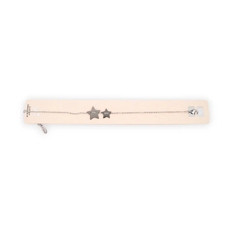 Questo braccialetto in acciaio argentato ridefinisce il fascino contemporaneo con un tocco di innovazione. Dotato di due stelle, una grande e una piccola, questo gioiello gioca sui contrasti e la dinamica del movimento. Queste stelle, libere di muoversi, aggiungono un aspetto giocoso e vivace a questo pezzo, catturando l'essenza del cielo notturno in movimento. Appese a una catena sottile e delicata di 21 cm, scorrono con grazia al ritmo dei vostri movimenti, offrendo uno spettacolo affascinante e mutevole. Questo braccialetto è l'incarnazione della sofisticatezza moderna, perfetto per coloro che cercano di esprimere la loro individualità e il loro amore per i disegni che escono dall'ordinario.