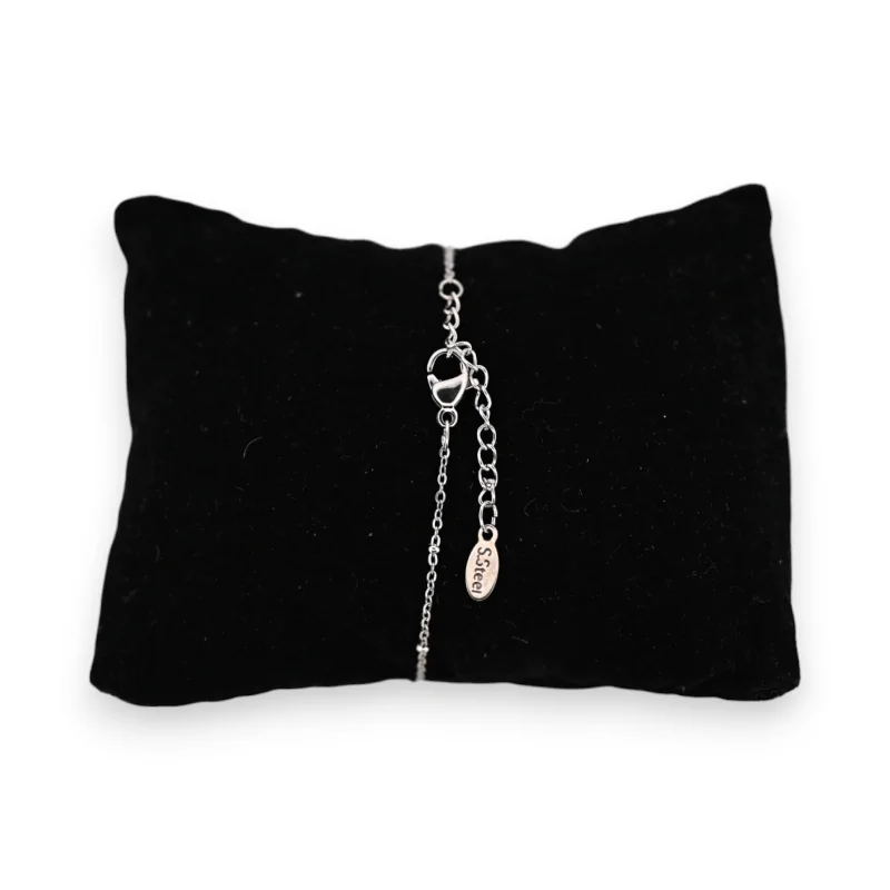 Questo braccialetto in acciaio argentato offre un'interpretazione affascinante della bellezza notturna con la sua mezza luna madreperla, che gioca con la luce per rivelare uno spettro di colori incantevoli. Circondata da un cerchio scintillante di strass, questa luna crea un punto focale di pura bellezza e fascino, ricordando le notti stellate e il mistero dell'universo. Attaccato a una catena sottile di 21 cm, questo gioiello combina eleganza, raffinatezza e un tocco di mistero. Con la sua presenza sia discreta che notevole, è ideale per coloro che apprezzano le pezzi sottili ma espressivi, offrendo un fascino sia sofisticato che coinvolgente. Perfetto per adornare il tuo polso con uno splendore celeste, questo braccialetto è un tesoro di delicatezza e brillantezza.