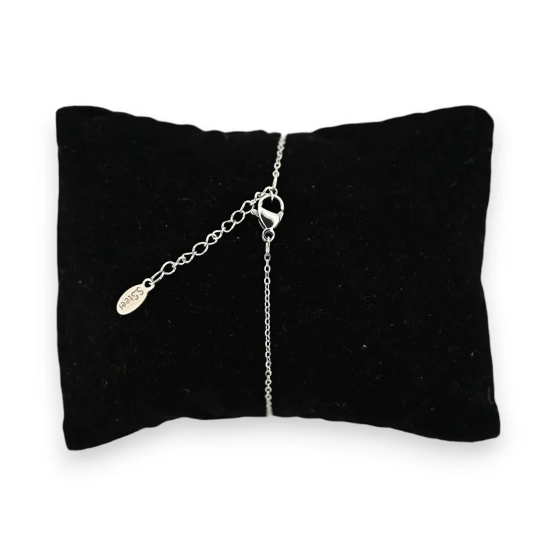 Questo braccialetto in acciaio argentato si distingue per la sua naturale eleganza e il suo affascinante dettaglio centrale: un piccolo gatto sagomato, che evoca la delicatezza e l'affetto. Questo motivo, sia sobrio che discreto, è un'ode all'affetto e alla complicità che gli amanti dei gatti condividono con i loro compagni felini. Sospeso su una catena delicata di 21 cm, questo gioiello combina con armonia la raffinatezza dell'artigianato e un design affettuoso, rendendolo un accessorio perfetto per ogni giorno o per fare un regalo a una persona cara. È una scelta meravigliosa per chi desidera indossare un simbolo della loro passione per gli animali, mantenendo allo stesso tempo un'immagine raffinata e discreta.