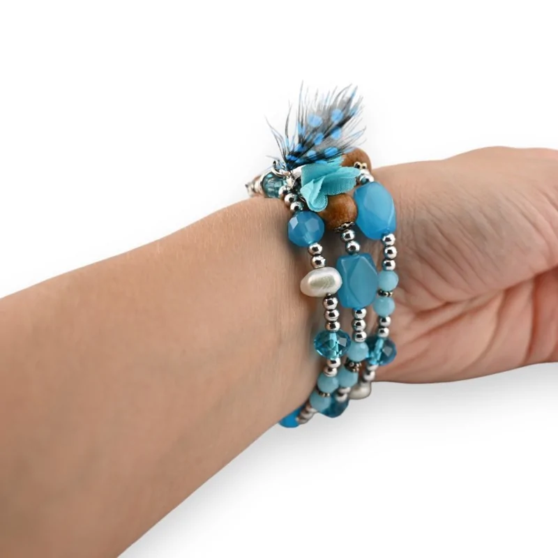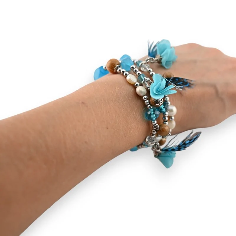 Ogni braccialetto di questo set presenta un design unico, combinando perline e ornamenti in armoniose sfumature di blu turchese, beige e marrone. I dettagli raffinati come i fiori in tessuto e le piume aggiungono un tocco bohémien chic all'insieme. Questi accessori versatili si abbinano bene sia a un outfit casual che a un look più elegante per una serata.