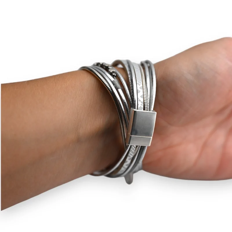Questo doppio braccialetto in materiale sintetico, di un'eleganza senza tempo, si avvolge con grazia attorno al polso, rivelando uno spettro di nero profondo. Ornato di strass scintillanti e borchie argentate, incarna un raffinato distintivo. Il suo meccanismo di chiusura a pressione, progettato per una facilità d'uso, semplifica la sua regolazione sul polso. Con i suoi 40 cm di lunghezza, questo gioiello è l'incarnazione del lusso accessibile, perfetto per arricchire qualsiasi outfit con un tocco di sofisticatezza.