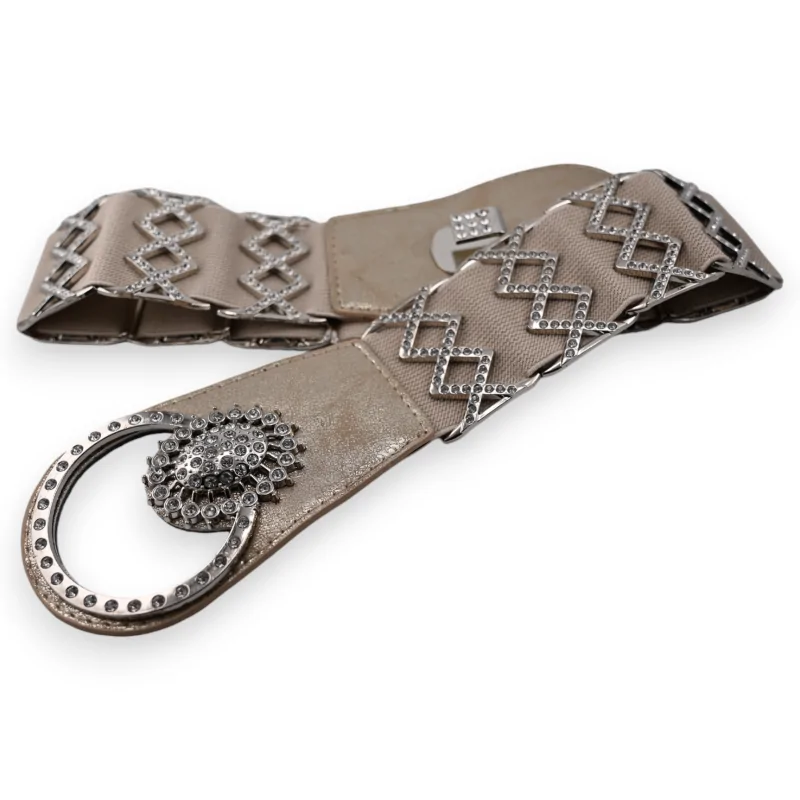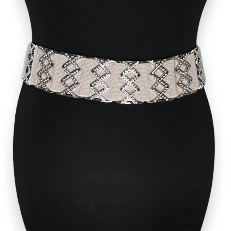 Aumenta il tuo stile con questa cintura elastica da donna, un'opera d'arte fusione di tonalità dorate e argentate. Ogni segmento della cintura è ornato di brillanti strass, disposti in audaci e originali motivi geometrici. La pièce de résistance è la sua fibbia argentata, impreziosita da strass, che si unisce a un gancio per offrire una chiusura elegante. Questa cintura non è solo un accessorio, ma è una dichiarazione di stile ed eleganza. La sua palette di colori versatili si abbina senza sforzo con qualsiasi outfit, rendendola pratica ed alla moda. Misurando 82 cm senza stiramento, si adatta comodamente alle taglie fino a 42-44, garantendo una vestibilità perfetta per molte figure.