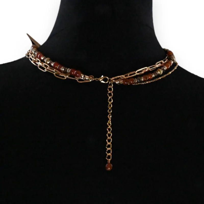 Evadi verso lontane terre con questo collier di fantasia tinteggiato di dorature luminose. Si compone di quattro file elaborate con cura, ogni segmento rivelando un disegno di maglia individuale. Alcune di queste maglie sono esaltate da pietre con tonalità marrone, evocando la ricchezza e il calore delle terre orientali. Gli ornamenti delicatamente incorporati in alcune delle catene rafforzano questa sensazione di evasione, portando chi lo porta in un'atmosfera orientale grazie ai suoi colori caldi e accattivanti. Con una dimensione di 38 cm, questo gioiello è una vera e propria invitazione al viaggio, portando un tocco di esotismo al tuo guardaroba.