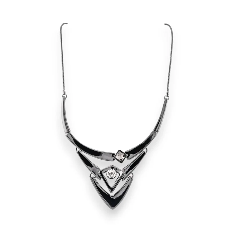 La collana Belle Miss si distingue per il suo design geometrico unico e accattivante. La sua struttura in metallo nero opaco mette in risalto forme audaci che attirano immediatamente lo sguardo. Il pendente principale è composto da triangoli intrecciati, creando un motivo dinamico e moderno. Questo pezzo centrale è impreziosito da delicati cristalli che aggiungono un tocco di brillantezza sottile, perfetto per catturare la luce e attirare l'attenzione. Il contrasto tra le linee pulite del metallo e la lucentezza dei cristalli conferisce a questa collana un equilibrio perfetto tra sobrietà e sofisticatezza.