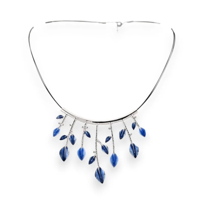 La collana con foglie argento e blu di Ikita si distingue per il suo originale pendente a forma di rami. Delicate foglie blu sono sospese a uno stelo in metallo argentato curvo, creando un elegante effetto di cascata vegetale. Questo design si ispira alla bellezza della natura per offrire un gioiello allo stesso tempo poetico e raffinato. Le diverse sfumature di blu delle foglie conferiscono profondità e movimento all'insieme.