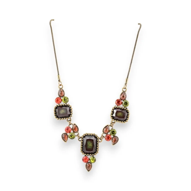 Lo stile barocco antico di questa collana Ikita ne fa un vero e proprio pezzo forte che non mancherà di attirare tutti gli sguardi. I suoi ornamenti elaborati e le sue curve graziose evocano il fasto e l'opulenza delle epoche passate, pur rimanendo decisamente contemporanea. I tocchi di verde e arancione apportano una nota di colore sottile che contrasta armoniosamente con il metallo dorato invecchiato.