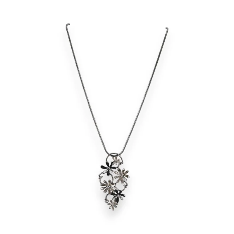 Questa magnifica collana fantasia del marchio Ikita presenta uno splendido medaglione composto da molteplici fiori grigi e neri. Realizzata in metallo grigio scuro, misura 25 cm di altezza ed è dotata di una catenina di prolunga di 8 cm per adattarsi a tutte le morfologie. Il suo design floreale elegante e contemporaneo la rende un accessorio perfetto per impreziosire i vostri outfit quotidiani o per occasioni speciali.