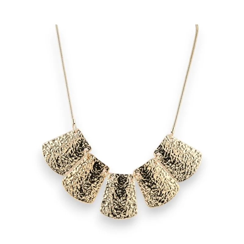 Questa collana fashion dorata del marchio Ikita si distingue per il suo design originale e raffinato. La sua particolarità risiede nel suo effetto martellato che le conferisce un aspetto strutturato unico e attraente. Le placche dorate che compongono la collana riflettono sottilmente la luce, portando luminosità al vostro décolleté. Questo gioiello di bigiotteria unisce con brio eleganza e modernità per un risultato dei più seducenti.