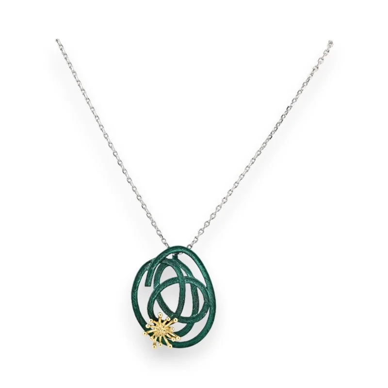 Il medaglione verde smeraldo costituisce il pezzo forte di questa collana. Il suo colore profondo e luminoso attira immediatamente lo sguardo. Il design asimmetrico e le curve fluide del pendente gli conferiscono un aspetto moderno e dinamico. Il fiore dorato in rilievo aggiunge un tocco di femminilità e delicatezza. Questa miscela di elementi crea un gioiello sia sofisticato che originale.