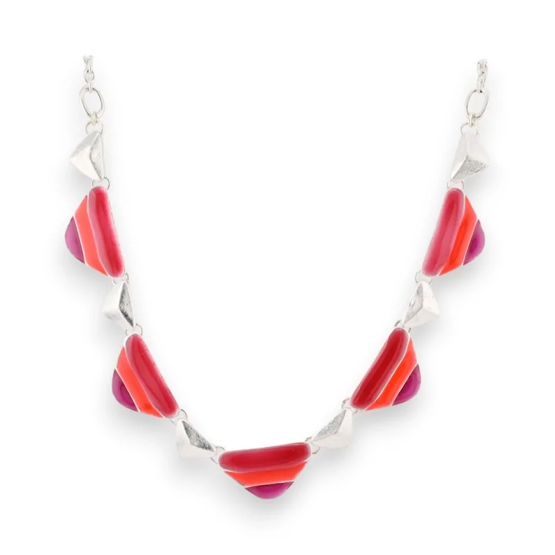 Questa collana fantasia del marchio Ikita aggiunge un tocco di colore ed eleganza al tuo outfit. Composta da una catena argentata di 20 cm con un'estensione di 8 cm, è decorata con ciondoli triangolari dai vivaci colori rosso, arancione e fucsia. Un gioiello alla moda che illuminerà il tuo décolleté con stile.