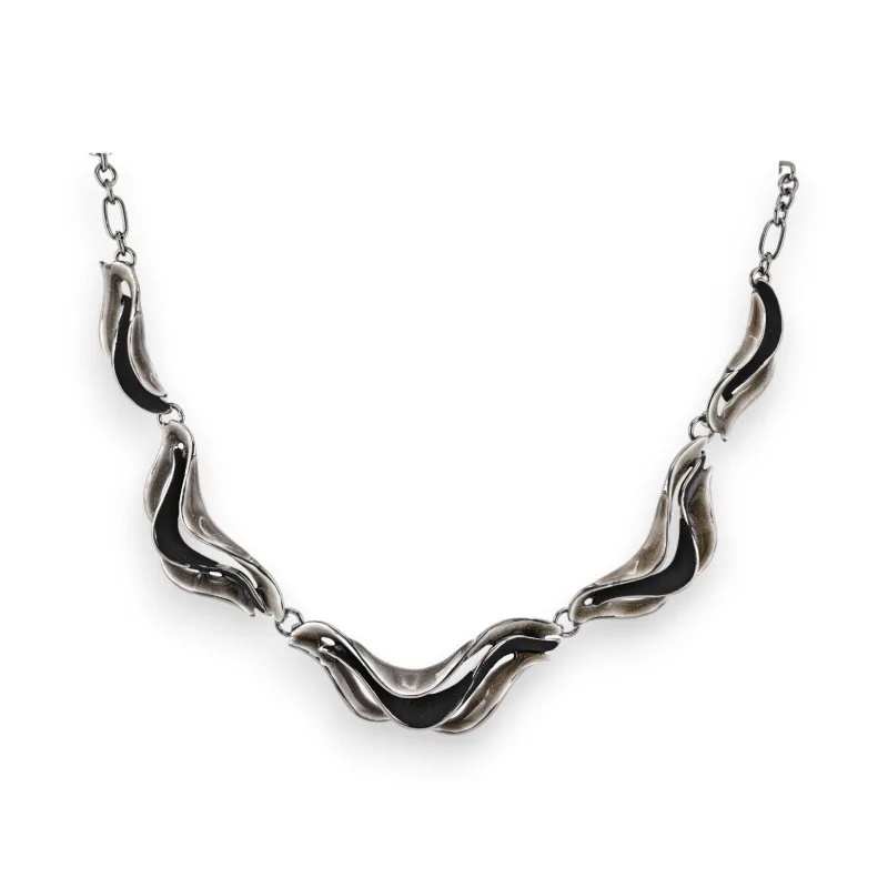 Questa collana fashion del marchio Ikita presenta un design originale a forma di onda in tonalità grigio scuro e nero. Realizzata in metallo, misura 19 cm di altezza con un'estensione di 7 cm per adattarsi a tutte le corporature. Il suo stile contemporaneo ed elegante la rende un accessorio perfetto per impreziosire i tuoi outfit quotidiani o da sera.