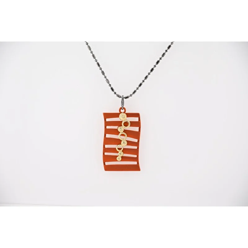 Questa collana fantasia del marchio Ikita è un vero pezzo di design che non mancherà di attirare tutti gli sguardi. Il suo ciondolo rettangolare traforato lo rende un gioiello allo stesso tempo elegante e originale. Il caldo colore mattone è sublimato da sottili dettagli dorati in rilievo che aggiungono un tocco di sofisticatezza. Con la sua lunghezza regolabile da 25 a 33 cm grazie a una catena di prolunga, questa collana si adatta perfettamente a tutte le morfologie e a tutti gli stili di abbigliamento.