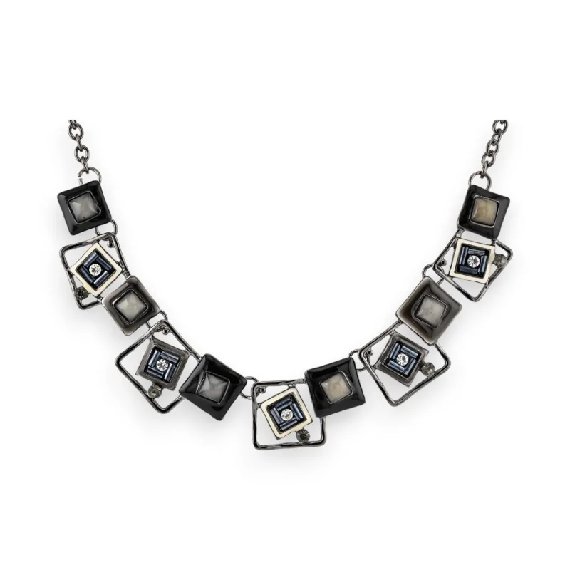 Questa collana di bigiotteria contemporanea unisce eleganza e modernità con il suo design geometrico in bianco e nero. Composta da quadrati e rombi intrecciati, aggiunge un tocco grafico ai tuoi outfit. La sua lunghezza di 40 cm con una prolunga di 6 cm si adatta a tutte le corporature. Un accessorio trendy per esaltare i tuoi look quotidiani o da sera.