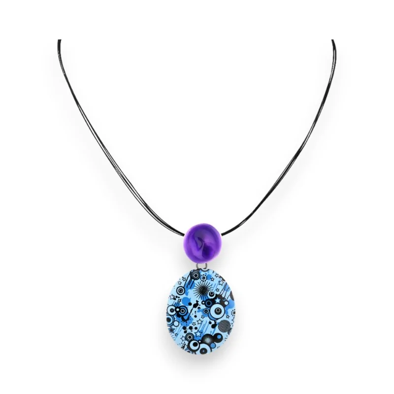 Questa collana fantasia Ikita si distingue per il suo ciondolo dal design cosmico accattivante. Il pendente circolare di 6,5 cm di diametro presenta un motivo blu e nero che evoca lo spazio, le stelle e i pianeti. Troviamo cerchi, stelle e forme astratte che si intrecciano in una composizione grafica affascinante. Le diverse sfumature di blu conferiscono profondità e rilievo a questo motivo cosmico. Una perla viola aggiunge un tocco di colore vibrante che contrasta piacevolmente con il blu del ciondolo. Questo design originale ed estetico ne fa un gioiello fantasia allo stesso tempo trendy e unico che non mancherà di attirare gli sguardi.