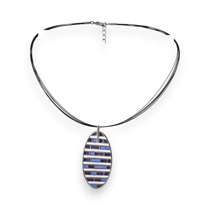 Questa collana di bigiotteria Ikita si distingue per il suo pendente ovale dal design geometrico originale. Le bande alternate blu e argentate creano un motivo a righe moderno ed elegante. La forma ovale del pendente, lungo circa 3 cm, aggiunge un tocco di dolcezza e femminilità. Il contrasto tra il blu profondo e la lucentezza dell'argento attira sottilmente lo sguardo, rendendo questo gioiello un vero punto di forza per il tuo stile.